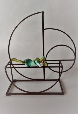 The woman made of bronze is warm and sensual and dances in a structure of rusted iron. The base rises impressively, creating a contradiction between both pieces. However, in Artigas Planas’ work , the geometrical base and the figure find a surprising harmony. In his sculptures the small goddess gets along with their everyday life. Joan is also able to show the efforts, joys and dreams of the quotidian life in their expressions.