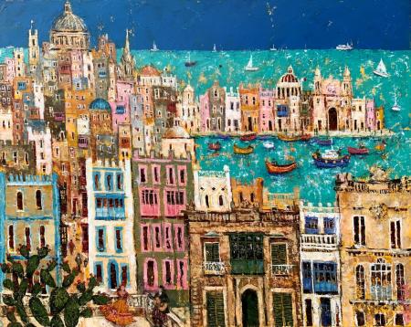 The palette knife is her tool of preference. and she uses it to build up layers of texture and depth of colour in her townscapes.