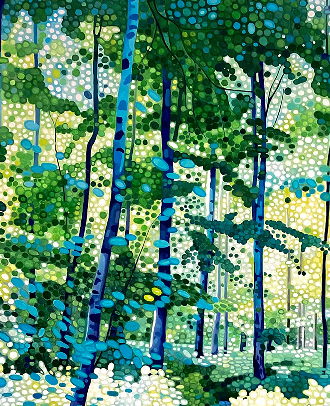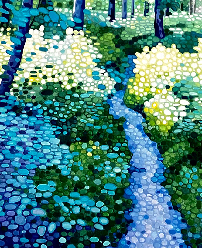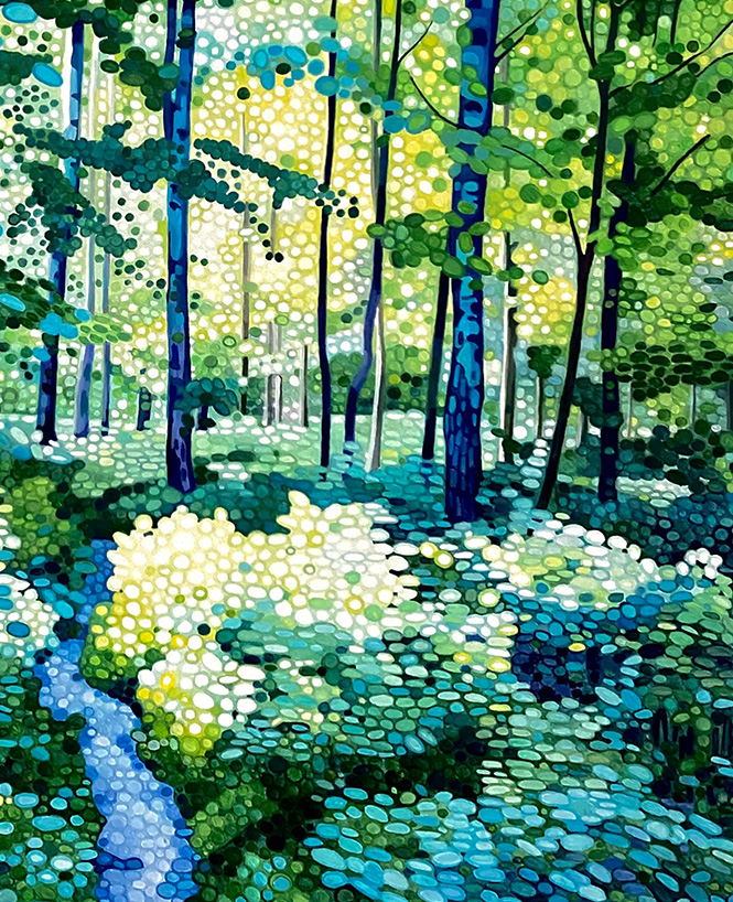 Ewa Adams is a landscape painter. Her painting is a contemporary take on Pointillism. She builds her images out of circles of pure colour juxtaposted next to one another. It is a slow, repetitive and meditation-like process. The result is a distinctive work of incredible freshness, vibrancy and luminosity. The humble landscapes are elevated, they glow with uplifting energy, they buzz with life. Her pallet is bright and bold, her understanding of the tone and colour interrelations is second to none. With paint she creates form, movement, sense of distance and light. She captures the beauty of the familiar world. Unremarkable becomes remarkable.