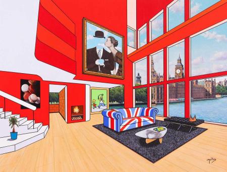 My painting style is like a visual journey between the retro and the iconic, with a pop-art twist that’s always aiming to steal a smile. I love filling my canvases with vibrant colors and crisp lines because, honestly, who needs subtleties when the world is already full of grays? My compositions feel like inviting your favorite idols into your living room or stepping into a retro café where time seems to have stopped. For instance, in one piece, I might place you in front of the majestic Big Ben while you lounge on a vintage sofa packed with cult-favorite details (yes, the kind you instantly recognize!). In another, I give you a window to the iconic Golden Gate Bridge, but with a cozy, homey warmth that makes you want to stay and read by the fire for a while. Then there are my more nostalgic pieces, like a classic American diner where the checkered floors and red stools practically take centerstage. There, you can imagine yourself listening to rock & roll while sipping a coffee—everyday moments have their own charm too! Each piece is my way of paying tribute to moments, places, and objects that, in one way or another, have been etched into our collective memory. Plus, I adore playing with open perspectives that invite you to step into the scene, as if you’re part of a movie blending modern vibes with nostalgia. In short, I paint worlds you’d probably want to move into if you could… and don’t blame me if you end up wanting to decorate your home like my paintings!