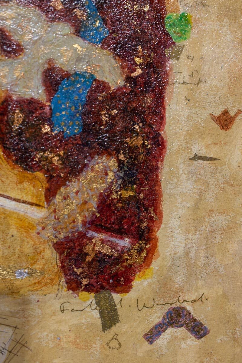 The plasterwork of the frescos is alluded to in his use of plaster as a base for his acrylic and oil overpaints. Also the influence of Egon Schiele and Gustave Klimpt can be seen in his occasional reference of line and decoration.