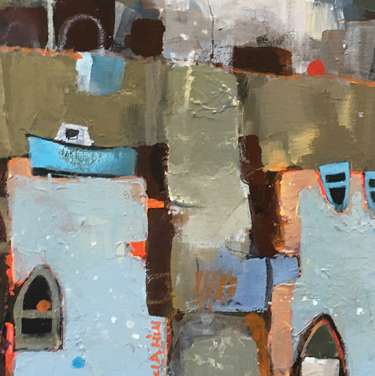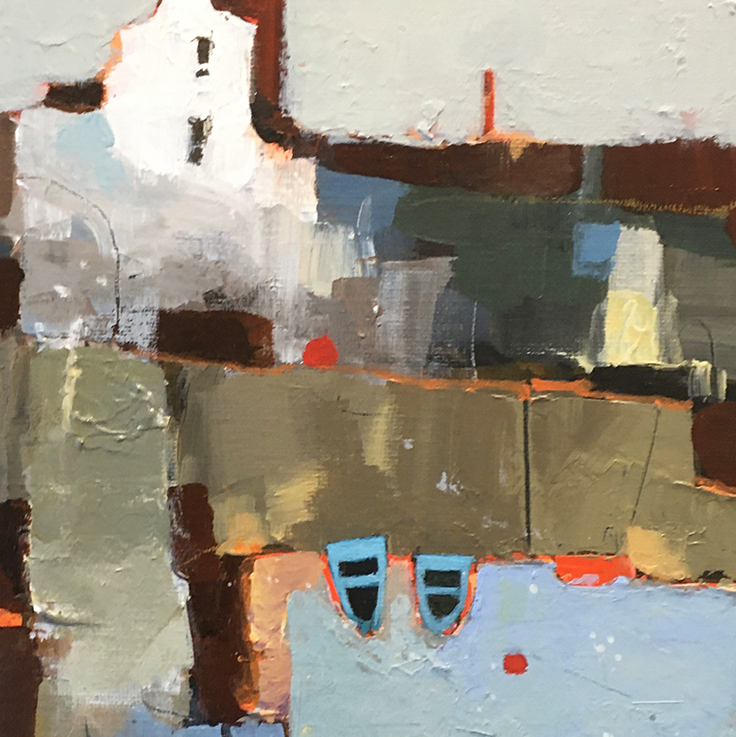 My paintings have become more abstract of late but it is important to me to convey a strong sense of place together with an air of mystery. Coming from fragments of memory, the painting surface is built up through layers of colour, sometimes leaving previous areas of paint exposed, maybe to indicate the history of the work.