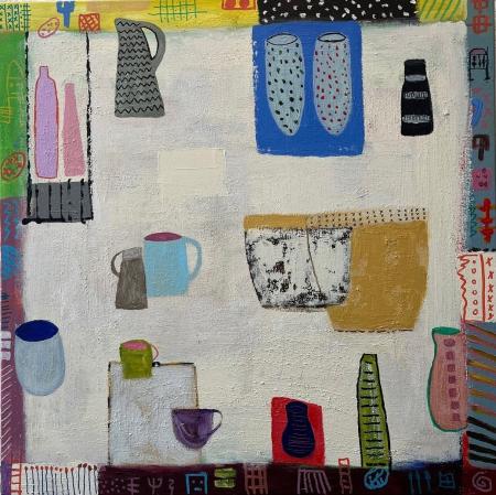 Born in Persia Gohar Goddard was educated in France and the foothills of the Himalayas. She came to England in her teens, working for a variety of organisations including the British Council, Jaeger and the NHS. In mid career, she set up Ziggurat, an elegant shop in Kensington, specialising in luxury yarns, followed by the creation of her own design label, English Weather, specialising in cashmere knitwear and silk and cashmere scarves. Attracted to the ceramics of Lucie Roe, she then trained as a potter. Over the last twenty years she has devoted most of her time to painting and drawing, finding inspiration in the work of William Scott, Roger Hilton, Tapies and Basquiat.