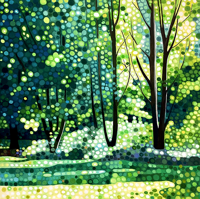 Ewa Adams is a landscape painter. Her painting is a contemporary take on Pointillism. She builds her images out of circles of pure colour juxtaposted next to one another. It is a slow, repetitive and meditation-like process. The result is a distinctive work of incredible freshness, vibrancy and luminosity. The humble landscapes are elevated, they glow with uplifting energy, they buzz with life. Her pallet is bright and bold, her understanding of the tone and colour interrelations is second to none. With paint she creates form, movement, sense of distance and light. She captures the beauty of the familiar world. Unremarkable becomes remarkable.