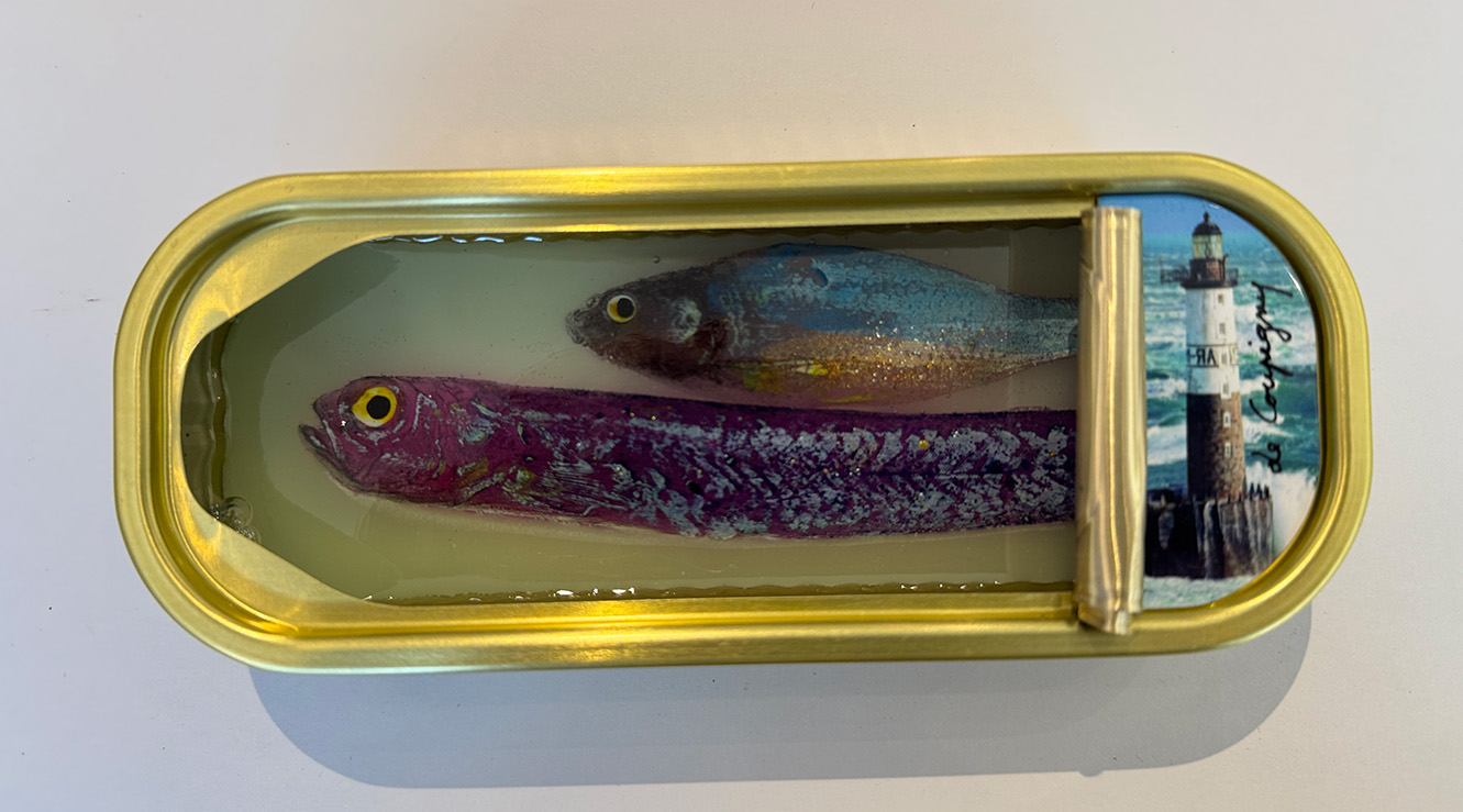 Genuine sardine tins (manufactured in Ortaire’s local area) are used to create an interesting dynamic between the industrial, mass-produced, everyday object and his hand painted, unique and often humorous representations of the fish. Ortaire uses intense pigments to create his unique painted fish before suspending them in paraffin and covering them with a transparent resin.