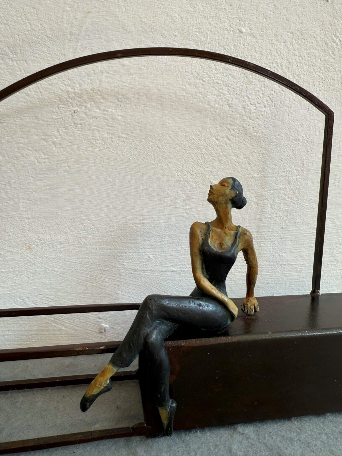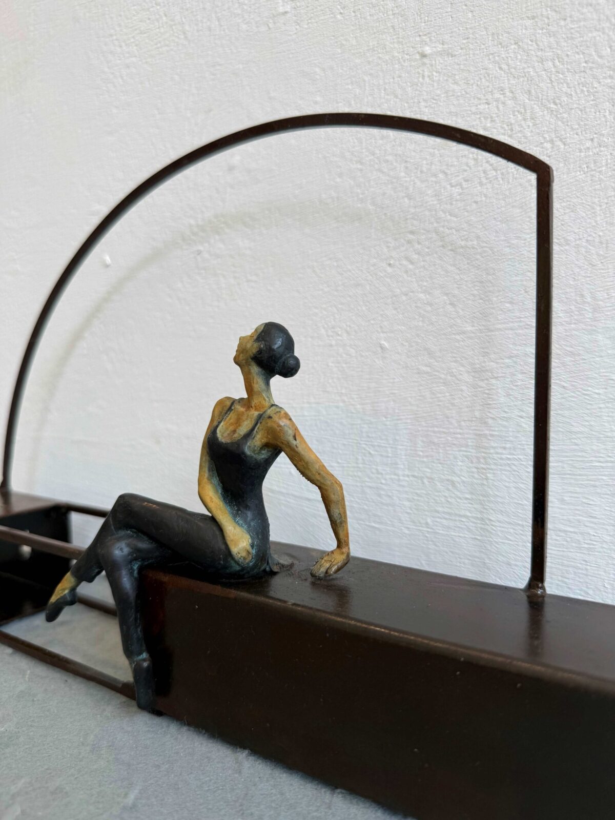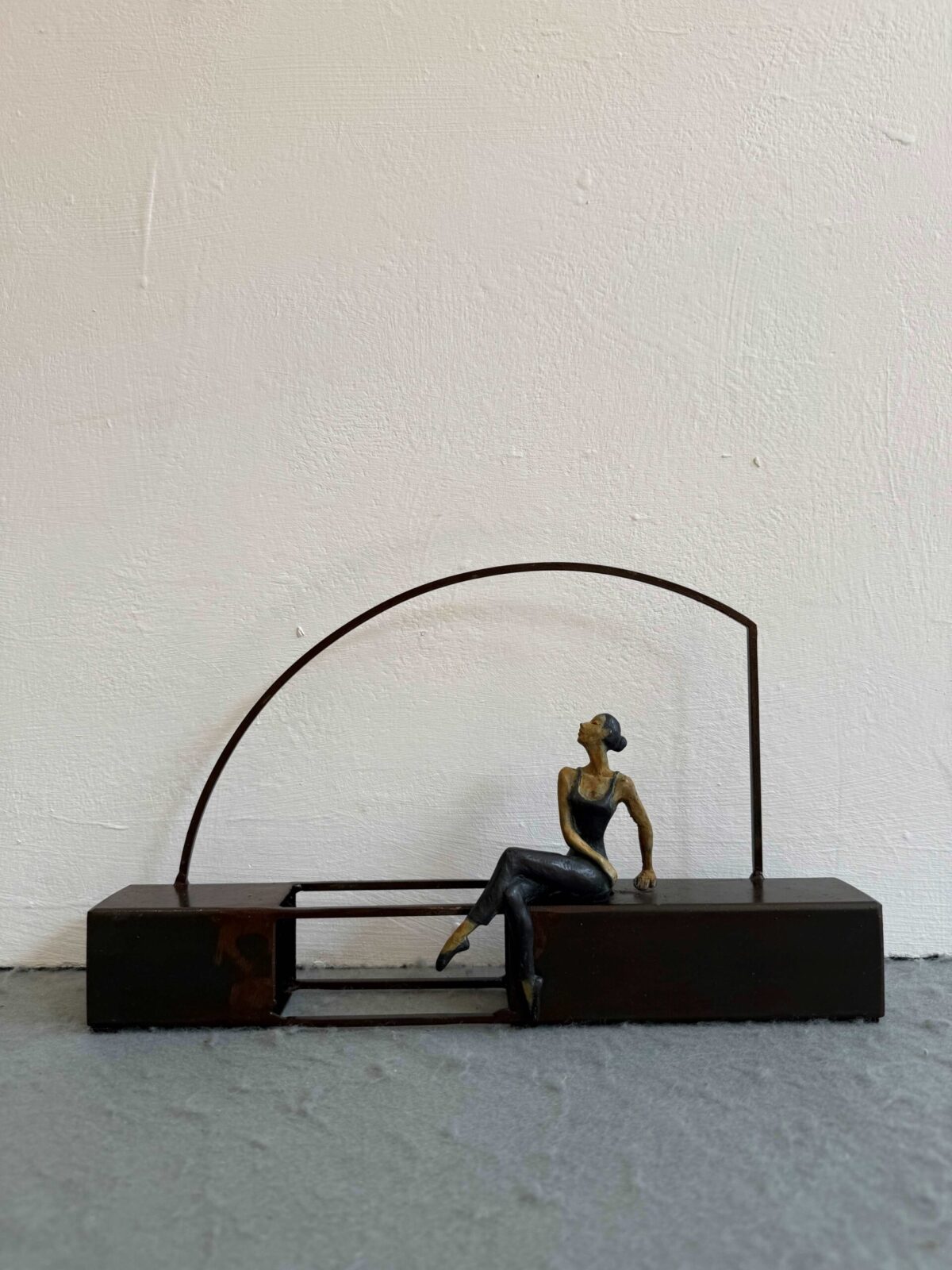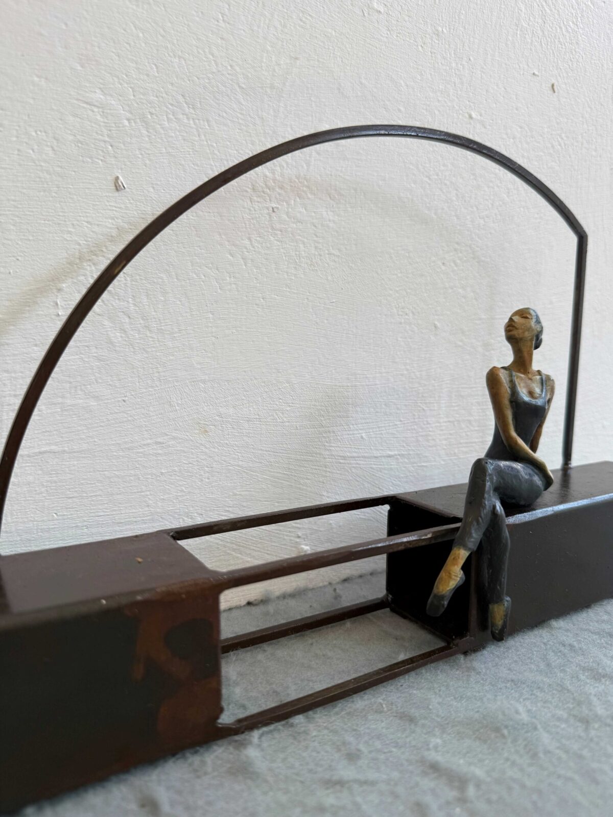 The woman made of bronze is warm and sensual and dances in a structure of rusted iron. The base rises impressively, creating a contradiction between both pieces. However, in Artigas Planas’ work , the geometrical base and the figure find a surprising harmony. In his sculptures the small goddess gets along with their everyday life. Joan is also able to show the efforts, joys and dreams of the quotidian life in their expressions.