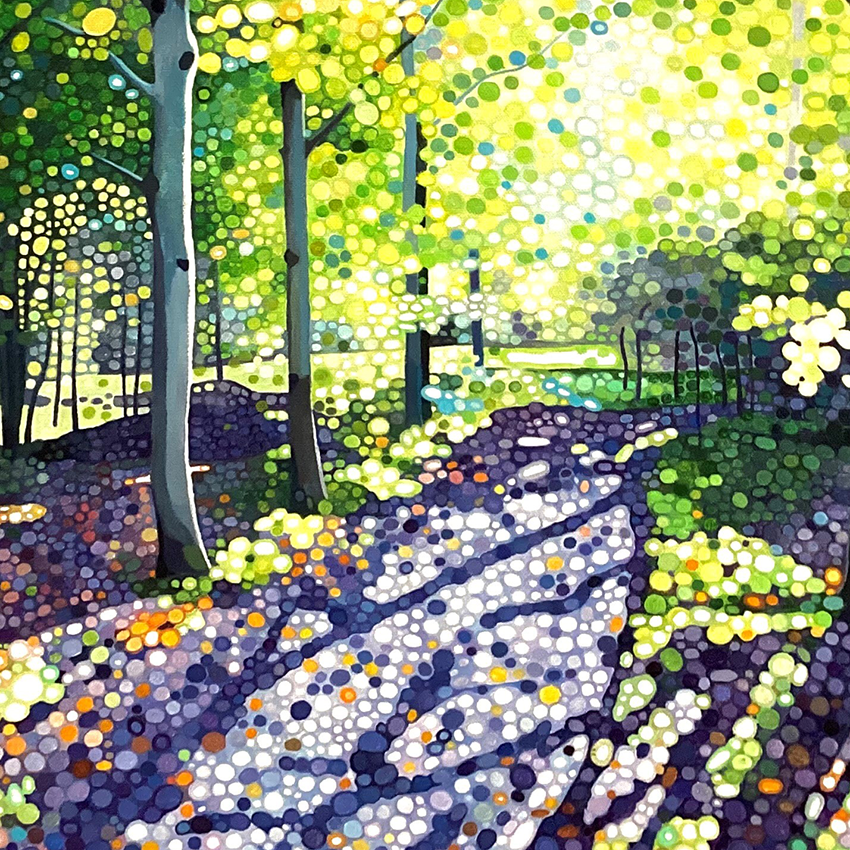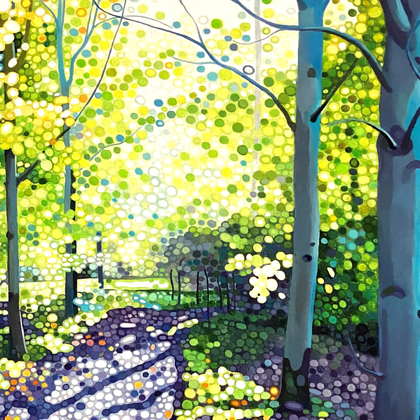 Ewa Adams is a landscape painter. Her painting is a contemporary take on Pointillism. She builds her images out of circles of pure colour juxtaposted next to one another. It is a slow, repetitive and meditation-like process. The result is a distinctive work of incredible freshness, vibrancy and luminosity. The humble landscapes are elevated, they glow with uplifting energy, they buzz with life. Her pallet is bright and bold, her understanding of the tone and colour interrelations is second to none. With paint she creates form, movement, sense of distance and light. She captures the beauty of the familiar world. Unremarkable becomes remarkable.