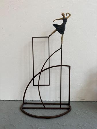 The woman made of bronze is warm and sensual and dances in a structure of rusted iron. The base rises impressively, creating a contradiction between both pieces. However, in Artigas Planas’ work , the geometrical base and the figure find a surprising harmony. In his sculptures the small goddess gets along with their everyday life. Joan is also able to show the efforts, joys and dreams of the quotidian life in their expressions.