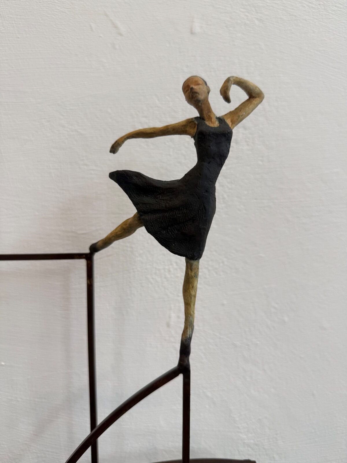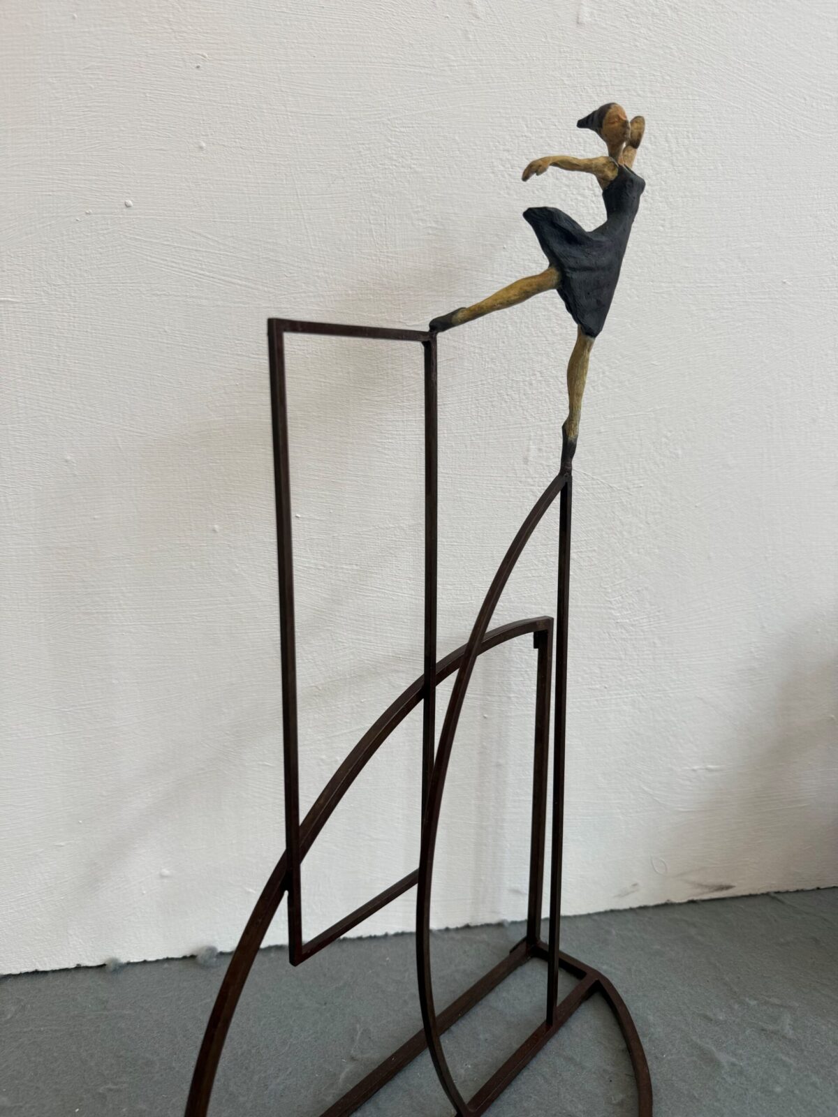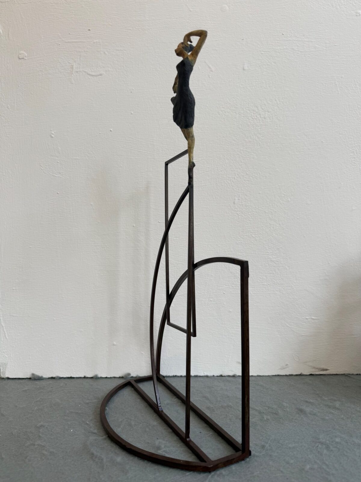 The woman made of bronze is warm and sensual and dances in a structure of rusted iron. The base rises impressively, creating a contradiction between both pieces. However, in Artigas Planas’ work , the geometrical base and the figure find a surprising harmony. In his sculptures the small goddess gets along with their everyday life. Joan is also able to show the efforts, joys and dreams of the quotidian life in their expressions.
