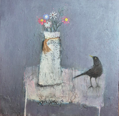 Alongside her evocative landscapes, Lisa creates still life compositions where inanimate objects intertwine with birds and animals, forming collections rich in character and quiet narrative charm.