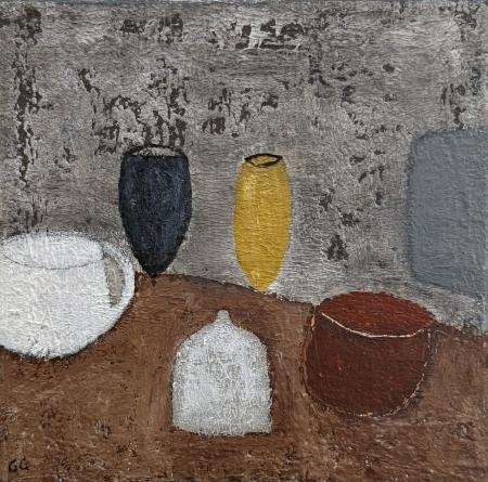 Born in Persia Gohar Goddard was educated in France and the foothills of the Himalayas. She came to England in her teens, working for a variety of organisations including the British Council, Jaeger and the NHS. In mid career, she set up Ziggurat, an elegant shop in Kensington, specialising in luxury yarns, followed by the creation of her own design label, English Weather, specialising in cashmere knitwear and silk and cashmere scarves. Attracted to the ceramics of Lucie Roe, she then trained as a potter. Over the last twenty years she has devoted most of her time to painting and drawing, finding inspiration in the work of William Scott, Roger Hilton, Tapies and Basquiat.