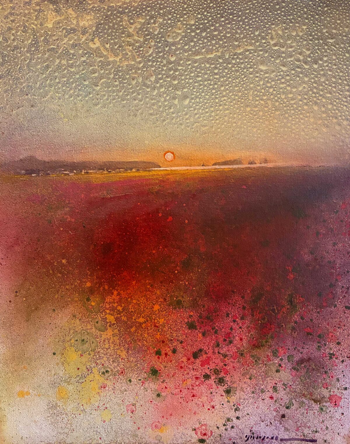 His work has a peaceful and charming atmosphere suddenly altered by the presence of splashes, textures and bright colors.