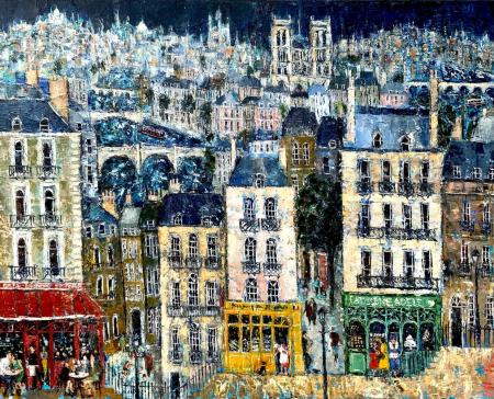 The palette knife is her tool of preference. and she uses it to build up layers of texture and depth of colour in her townscapes.