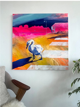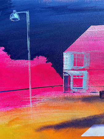 The juxtaposition between the sky and the foreground is a regular feature, prompting a sense of calm contemplation. Presenting the viewer with familiar scenes from distinct perspectives, Claire’s work explores the familiar with a sense of novelty.
