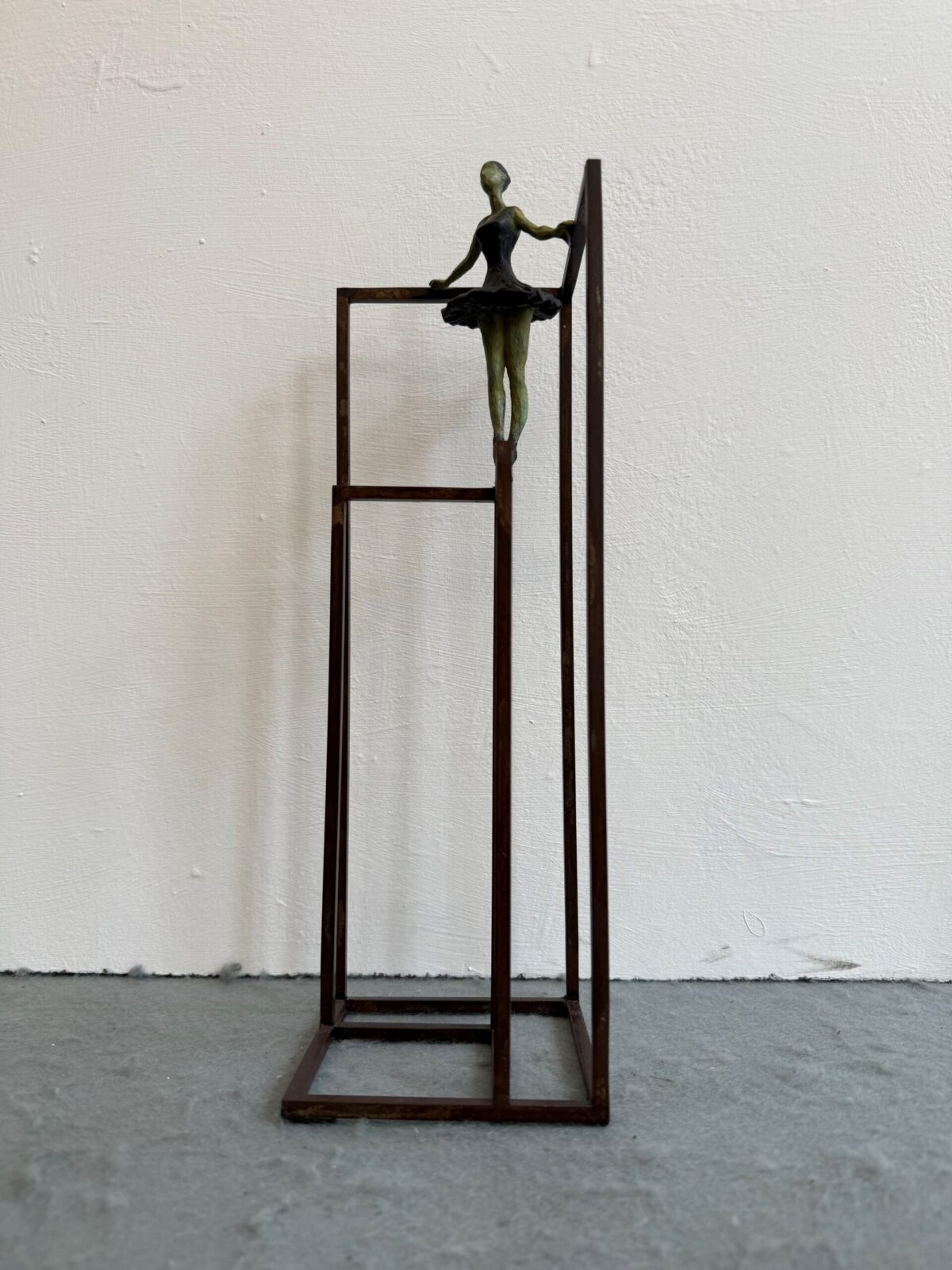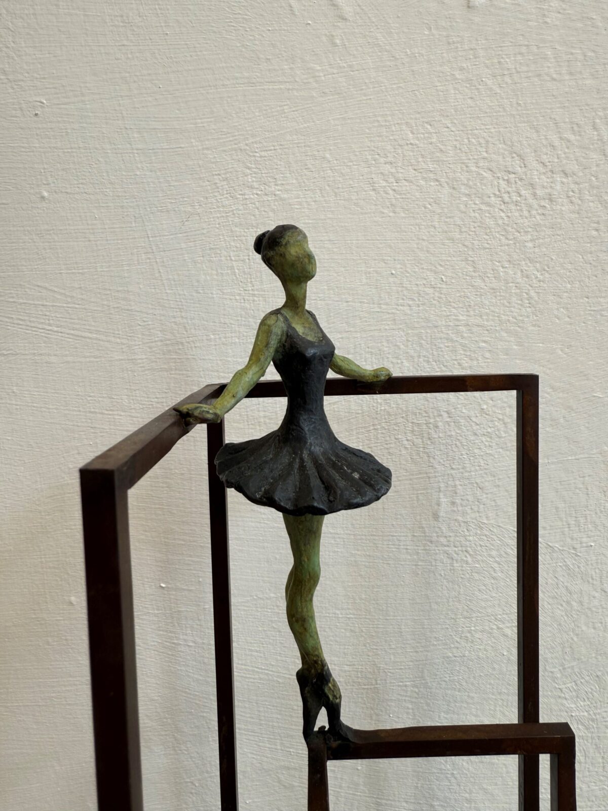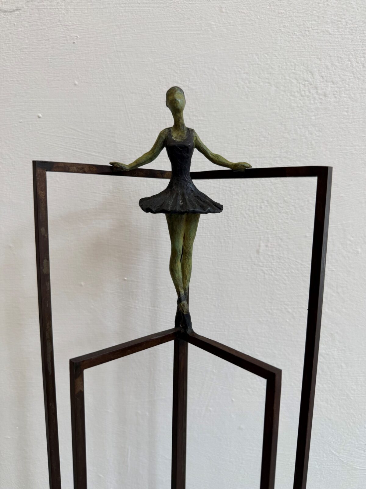 The woman made of bronze is warm and sensual and dances in a structure of rusted iron. The base rises impressively, creating a contradiction between both pieces. However, in Artigas Planas’ work , the geometrical base and the figure find a surprising harmony. In his sculptures the small goddess gets along with their everyday life. Joan is also able to show the efforts, joys and dreams of the quotidian life in their expressions.