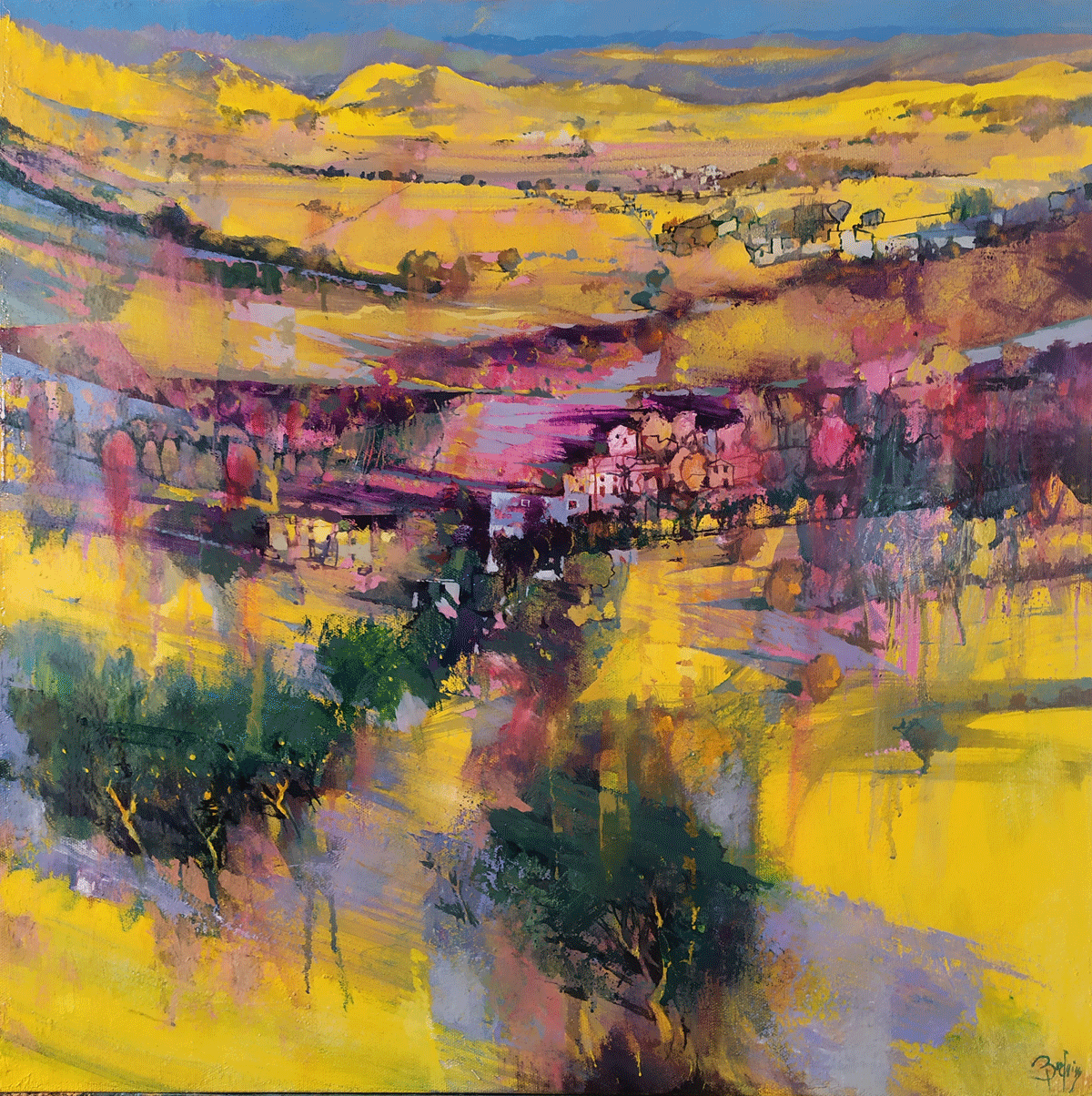 Currently living and working in Cuneo, North West Italy, Alex says “Painting is for me this dreamed landscape [consisting of] vertical or horizontal cuts… superimposing interplays, dismantled and dense images that look like rainbow geometries full of light and colour, [reflecting] its vibrancy and brilliance”.