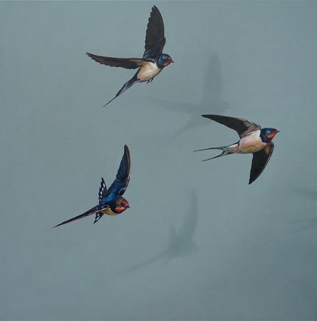 Ellis says “My childhood in Norfolk, watching and rescuing birds and animals, collecting bones and digging up skulls, led to a continued fascination with the fragile and fleeting nature of birds; something that I strive to capture a reflection of in these paintings. Imagery is combined with an assortment of inspiration and ideas to lend a quiet narrative or concept to each painting.”