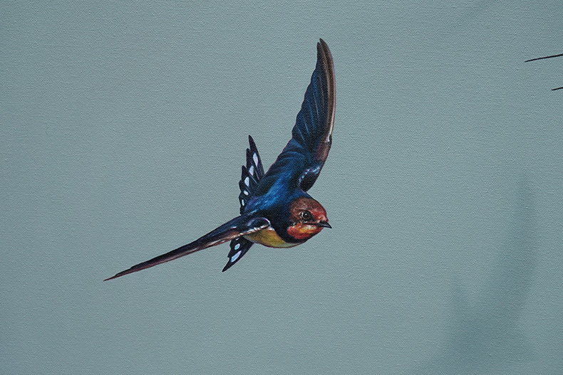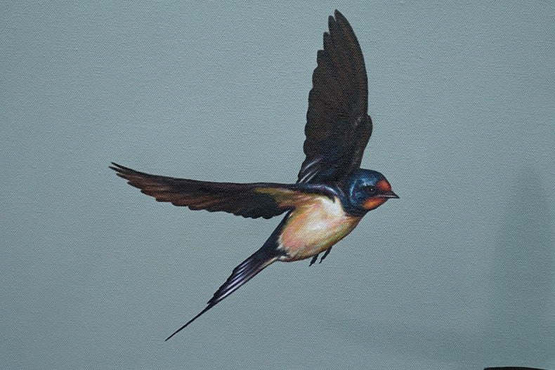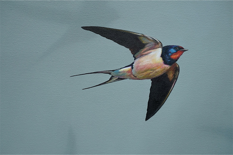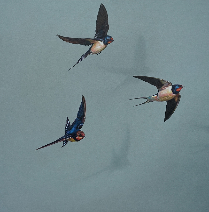 Ellis says “My childhood in Norfolk, watching and rescuing birds and animals, collecting bones and digging up skulls, led to a continued fascination with the fragile and fleeting nature of birds; something that I strive to capture a reflection of in these paintings. Imagery is combined with an assortment of inspiration and ideas to lend a quiet narrative or concept to each painting.”